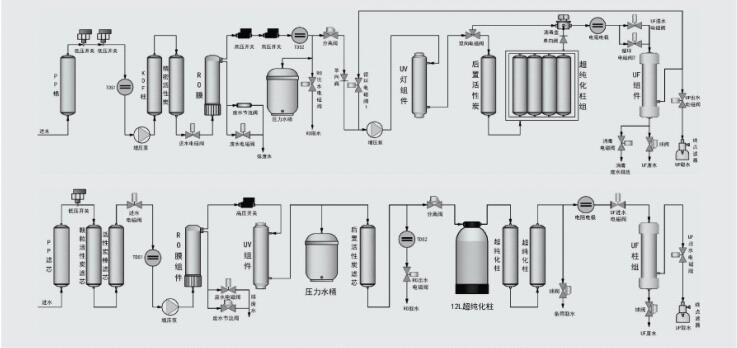 3、采用EDI方式,其流程如下:實驗室超純水系統(tǒng),超純水設(shè)備 原水→原水加壓泵→多介質(zhì)過濾器→活性炭過濾器→軟水器→精密過濾器→一級反滲透機→中間水箱→中間水泵→EDI系統(tǒng)→微孔過濾器→用水點。